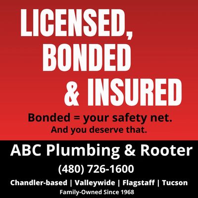 ABC Plumbing & Rooter is a small, employee-owned company that has been serving Chandler and the entire Valley for 30+ years. We work statewide, we stand behind every job we do, and yes—we’re fully: